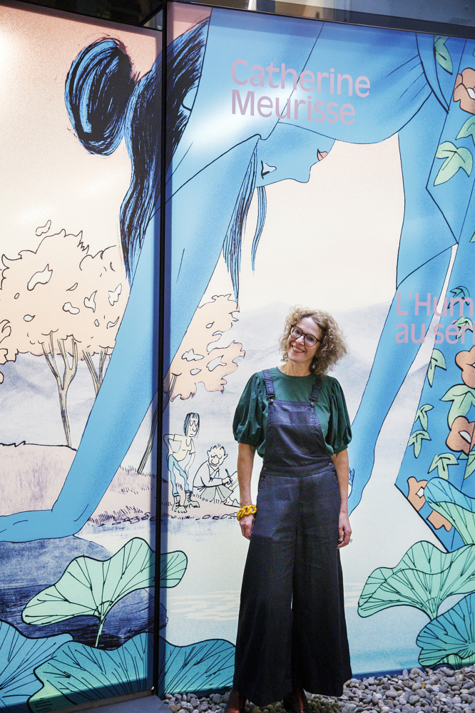 Anette Gehrig vor der Ausstellung «Catherine Meurisse. L’Humour au sérieux» © Cartoonmuseum Basel 2021